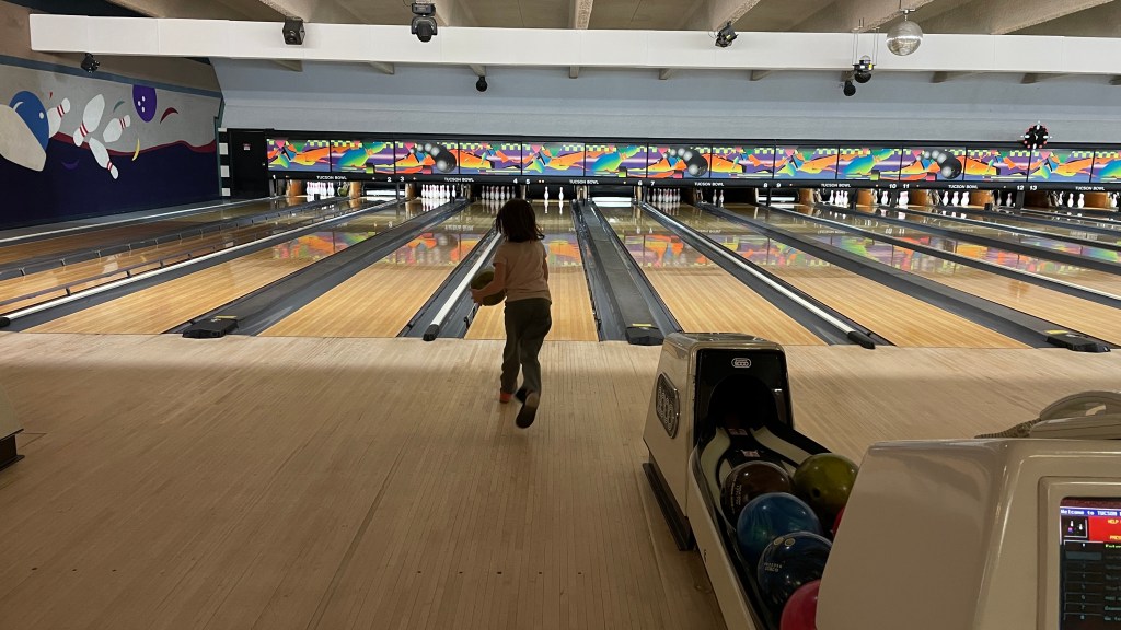 Today we took our grandchildren bowling. The kids said they had fun, we got a pizza and soda and an hour of bowling. The youngest, is seven, so we got bumpers. I used them twice. Lol. Most of the time I did really well. In fact I did so well I got over 100 – even after not bowling for ages, AND, more importantly… I beat Michael. LOL